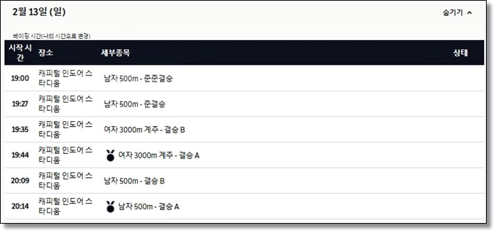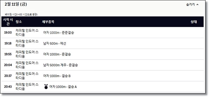 한국 출전 주요 경기 일정 다음은 베이징 동계올림픽에 출전하는 대한민국 선수들의 주요 경기 일정(한국 시각)입니다. 2월 5일 토요일 오후 10시 26분 쇼트트랙 혼성계주 2000m : 황대헌, 이준