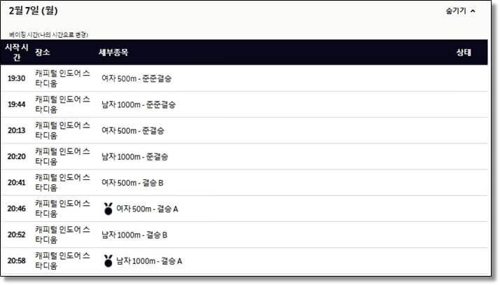 2월 7일 쇼트트랙 일정