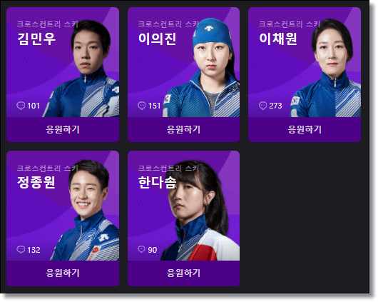 남자 : 김민석 김준호 이승훈 정재원 차민규