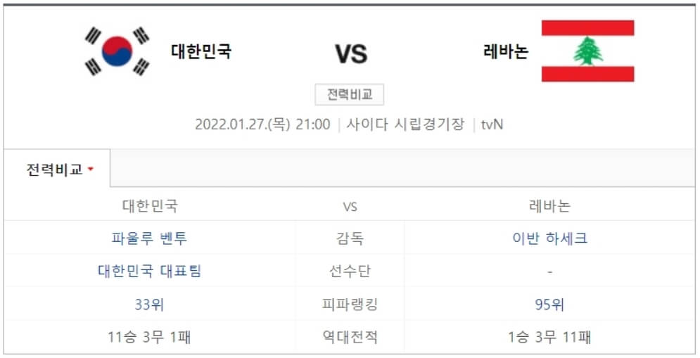하지만 레바논 원정경기는 최근 5경기 1승3무1패로 팽팽하기 때문에 경계를 늦출 수 없습니다.