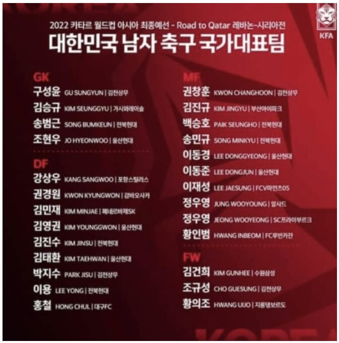 손흥민과 황희찬은 부상으로 이번경기에 합류하지 못하지만, 황의조(보르도)와 김민재(페네르바체), 이재성(마인츠), 황인범(루빈카잔), 정우영(알사드), 정우영(프라이부르크) 6명을 호출하였습니다.