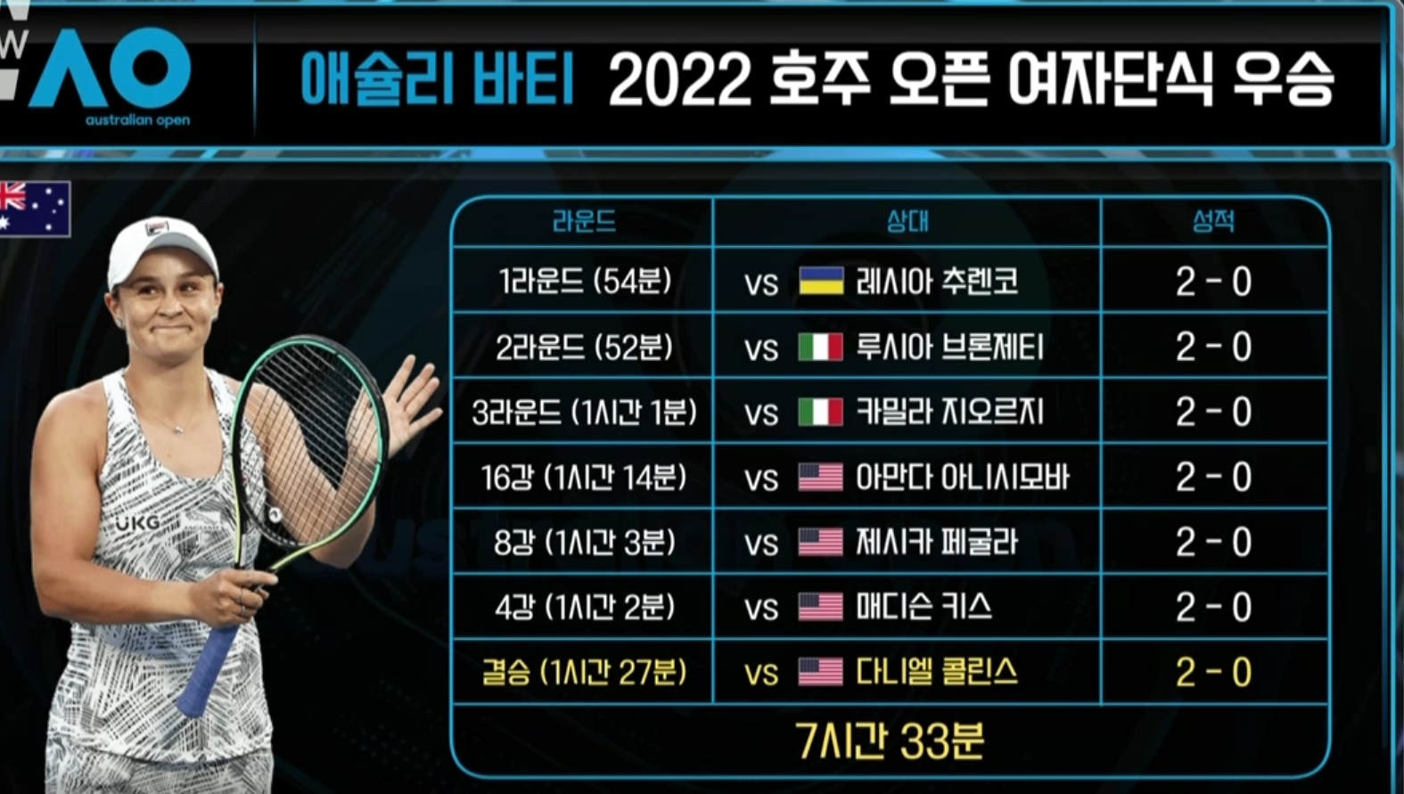 애슐리 바티 선수가 모든경기 2:0 이라는 압도적인 우승을 하였습니다.