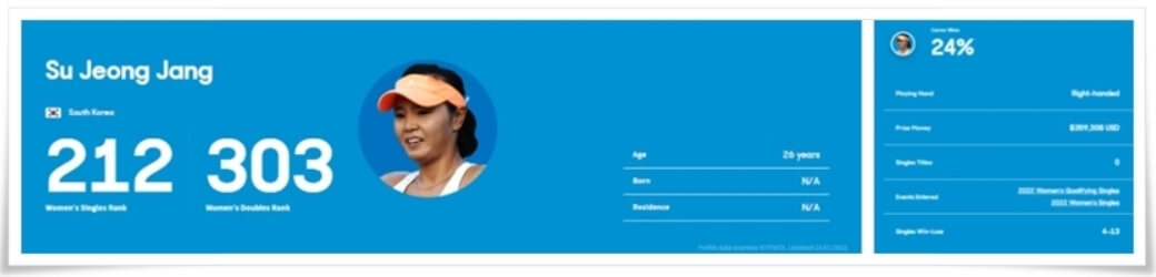 '국내 여자 테니스 랭킹 1위' 인 장수정은 1995년생으로 ITF에서 7개의 단식과 7개의 복식 타이틀을 획득하였습니다. 2017년 6월 12일에 커리어 하이 120위를 달성하였습니다.