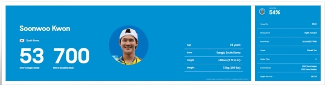 한국 남자테니스의 대표급인 권순우(25) 는 세계랭킹 54위이며, 지난 2019년 남자프로테니스 투어에 본격적으로 시작하여 세계적인 선수들과 싸우며 3년의 시간을 보냈습니다. 이 과정을 거치며 성과를 거두었으며, 랭킹도 꾸준히 100위권 이내로 유지해 왔습니다.